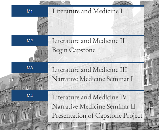 The track is comprised of four years (M1-M4) of the Literature and Medicine Elective (dedicated to the study of non-medical narratives), two years (M3&M4) of the Narratives Elective (monthly hour-long meeting dedicated to the exploration of narratives within medicine), and a scholarly capstone project to be completed between the M2-M4 years.